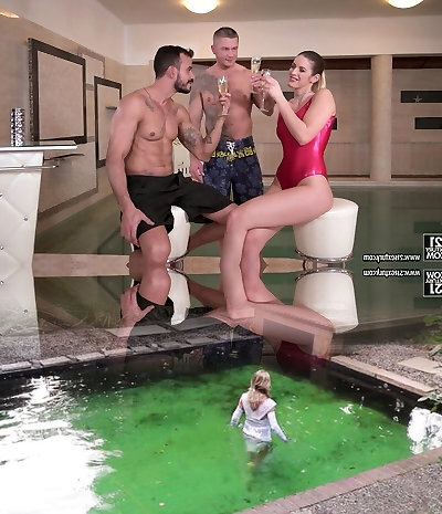 Fucking Bella Grey's Tight Pussy Between Two Sexy Studs on White Sheets!